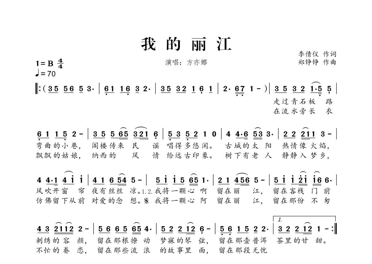 曲谱介绍: 方亦娜《我的丽江》,桃李醉春风编配出品,共有1张高清图谱,免翻页排版设计。