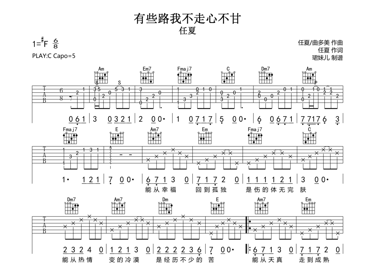 • 有些路我不走心不甘吉他谱 - 任夏 - C调吉他弹唱谱第1张