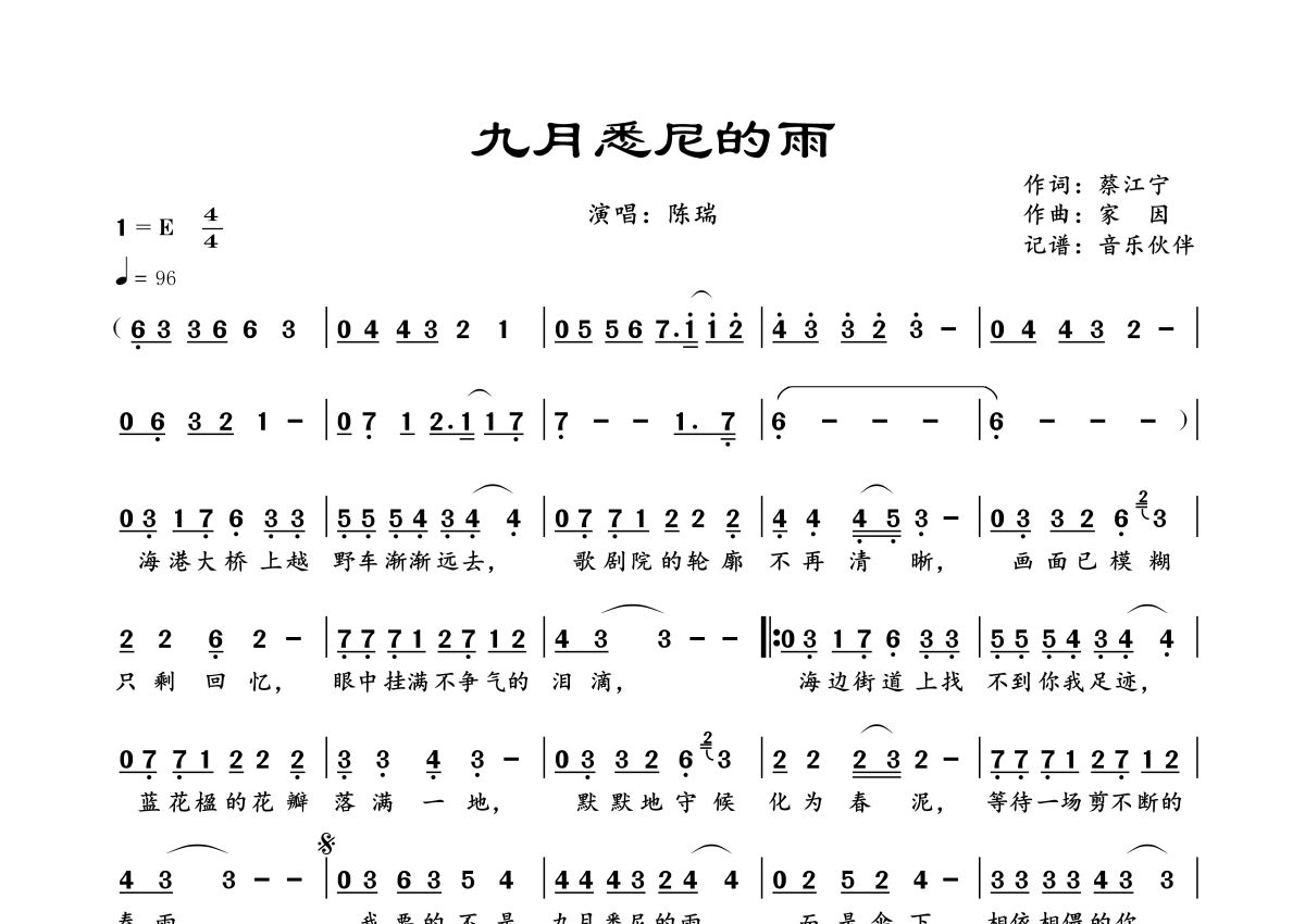 曲谱介绍: 陈瑞《九月悉尼的雨》,音乐伙伴编配出品,共有1张高清图谱,免翻页排版设计。