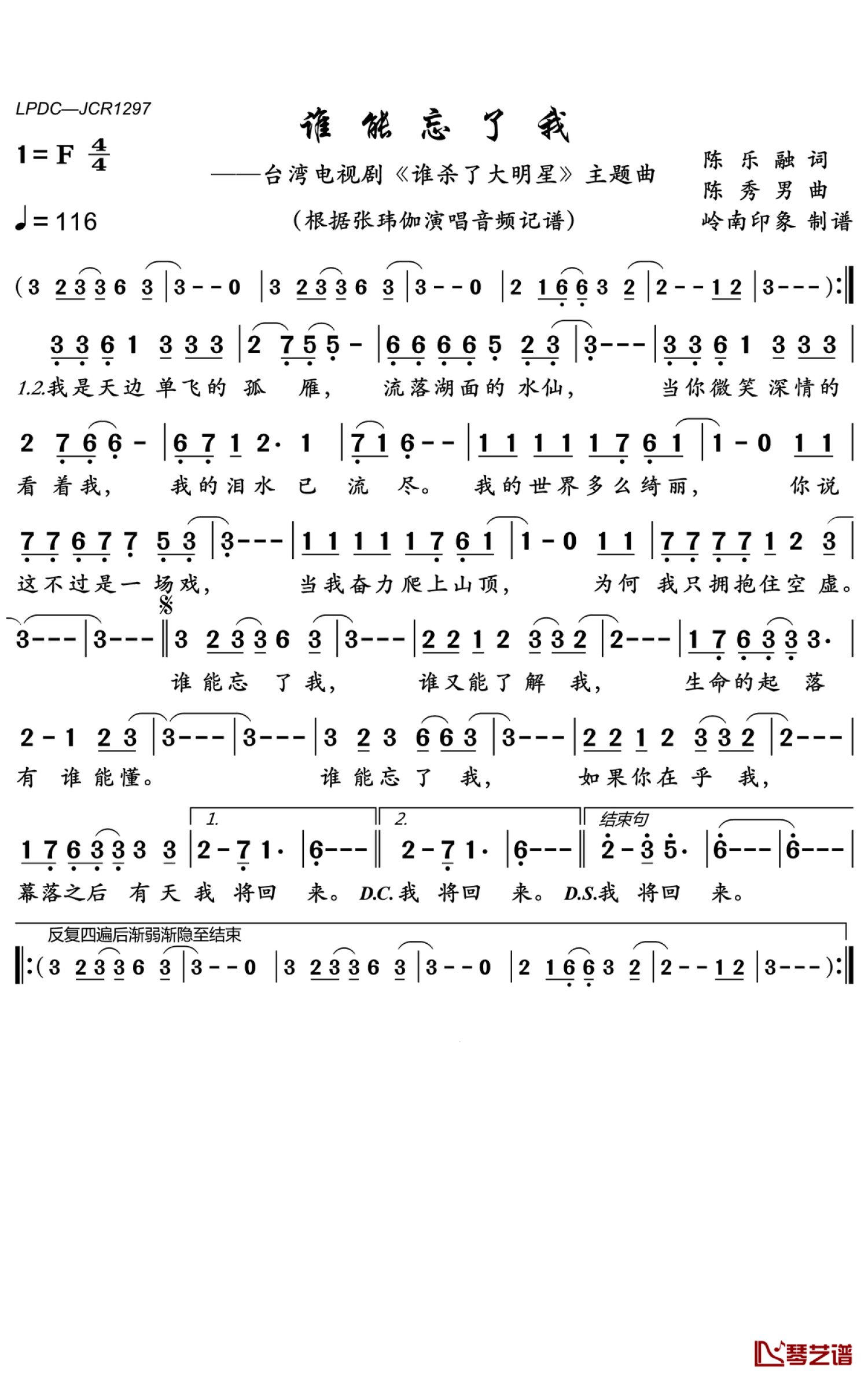 曲谱介绍: 张玮伽《谁能忘了我》歌词_简谱