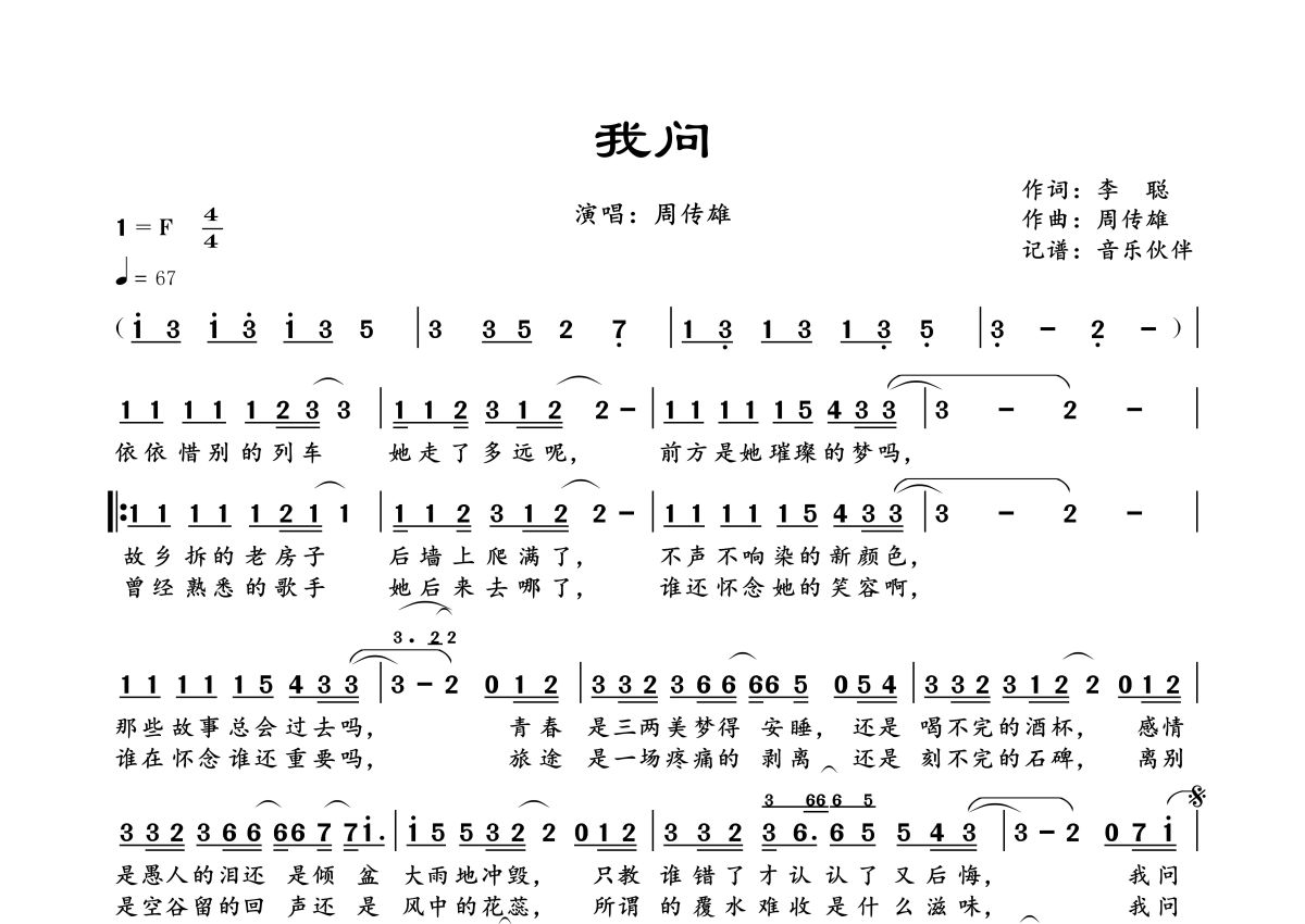 曲谱介绍: 周传雄《我问》,音乐伙伴编配出品,共有1张高清图谱,免翻页排版设计。