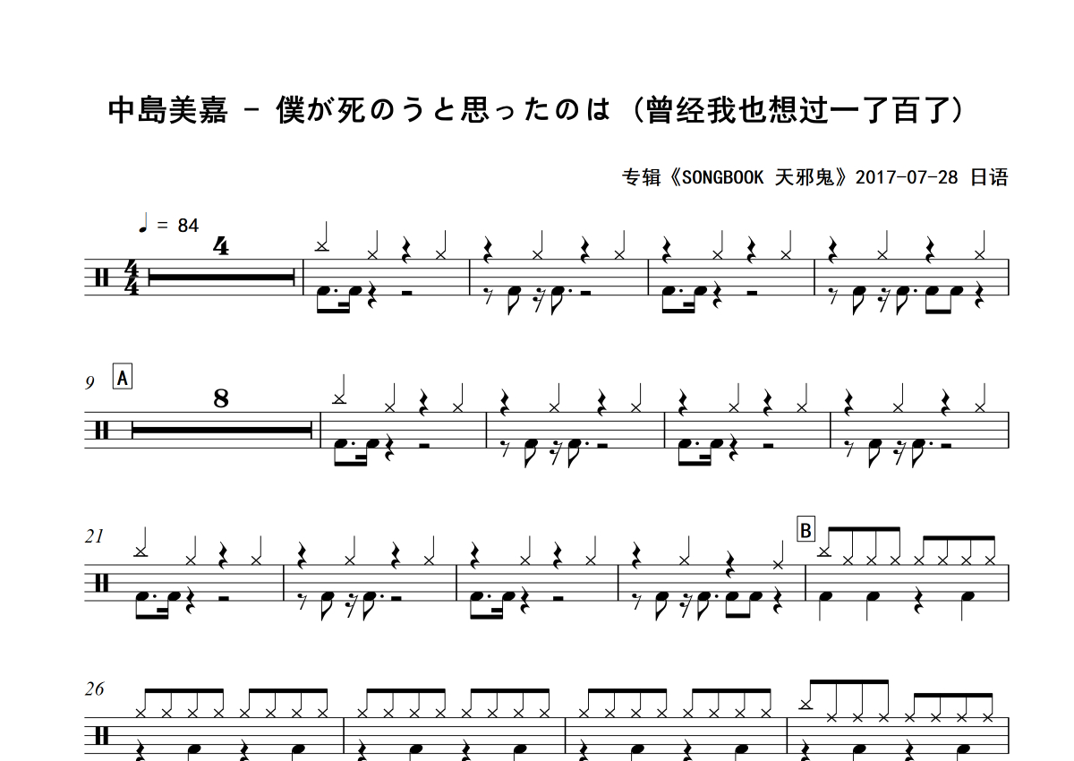 曲谱介绍: 中島美嘉《僕が死のうと思ったのは(曾经我也想过一了百了)》架子鼓谱专辑版,积极处世编配出品,共有3张高清图谱。