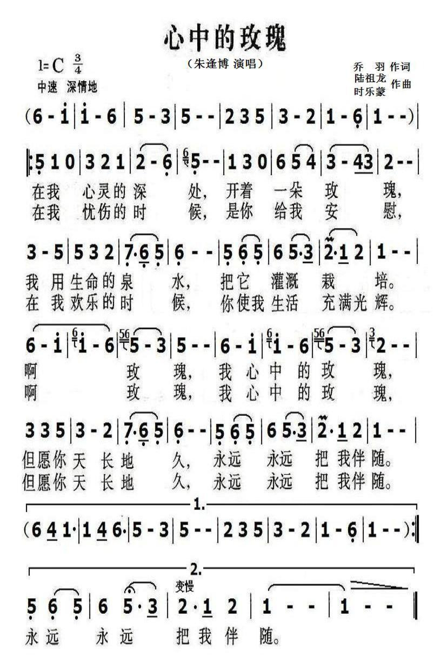心中的玫瑰简谱 - 朱逢博