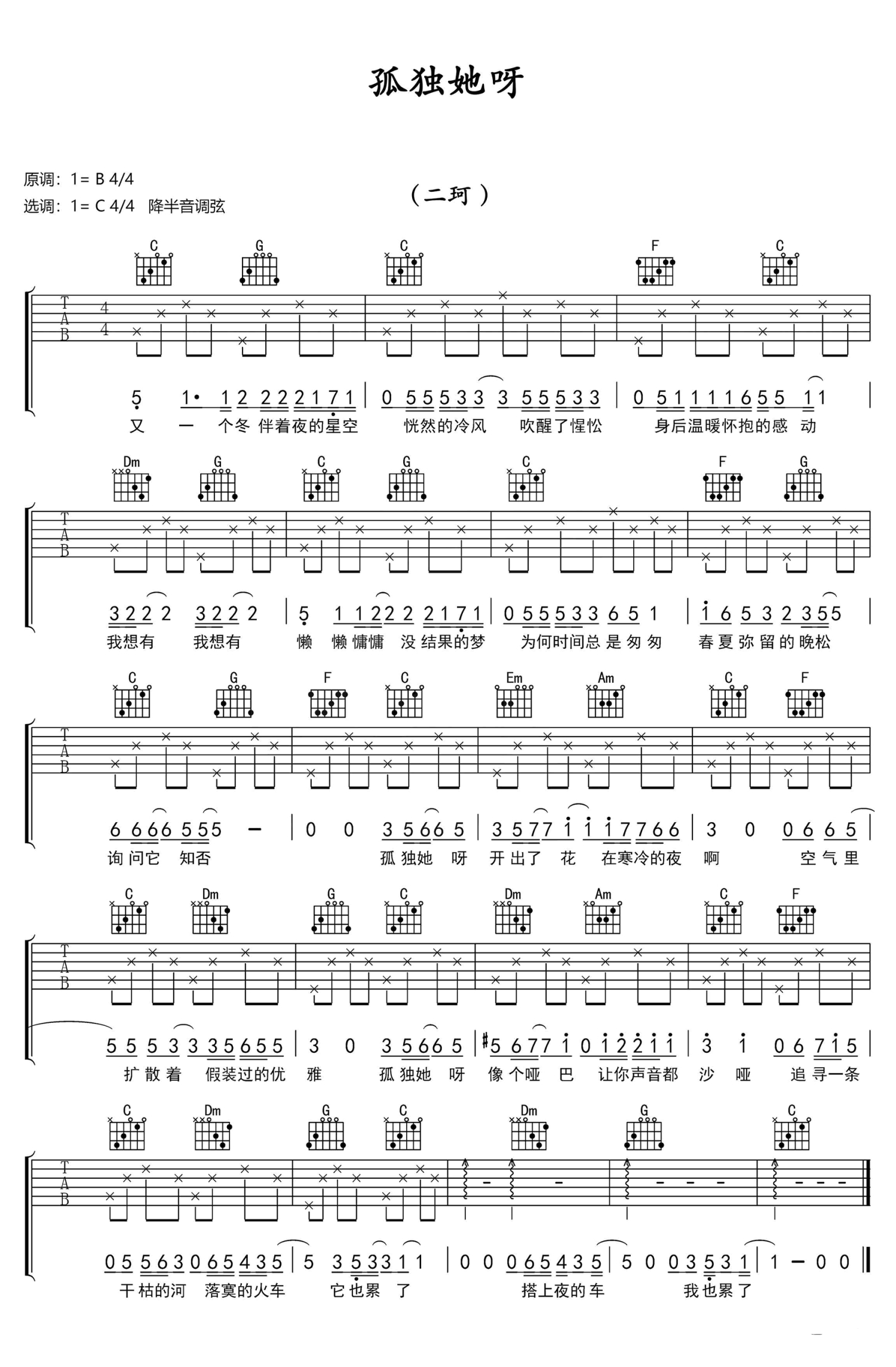 孤独她呀吉他谱 - 二珂 - C调吉他弹唱谱