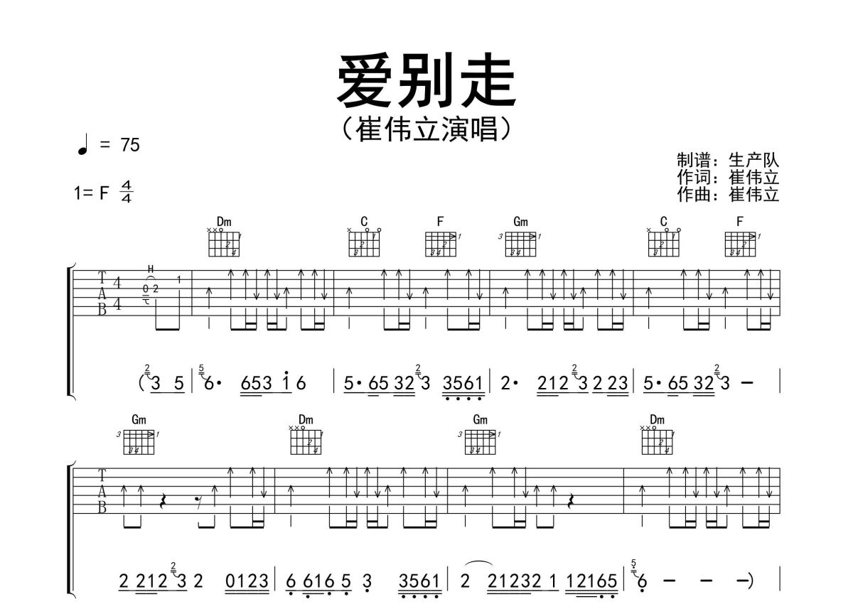 曲谱介绍: 崔伟立《爱别走》吉他弹唱谱,采用F调指法编配精编完美版,生产队编配出品,共有3张高清图谱。