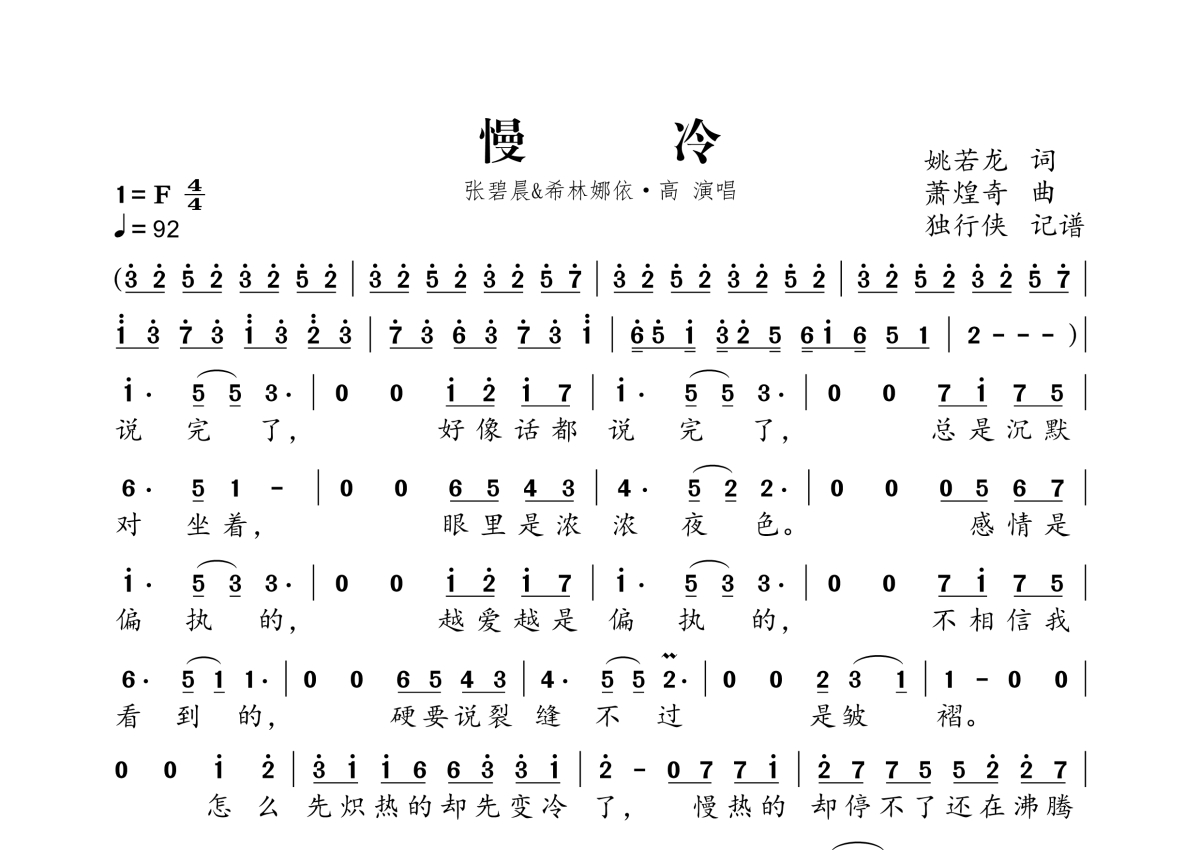 曲谱介绍: 张碧晨&希林娜依·高《慢冷》,独行侠编配出品,共有2张高清图谱,免翻页排版设计。