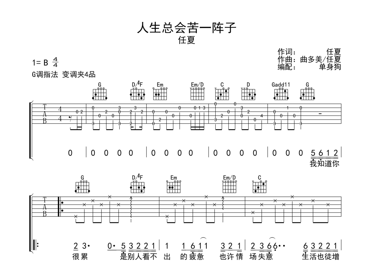 曲谱介绍: 任夏《人生总会苦一阵子》吉他弹唱谱,采用G调指法编配,单身狗编配出品,共有3张高清图谱。