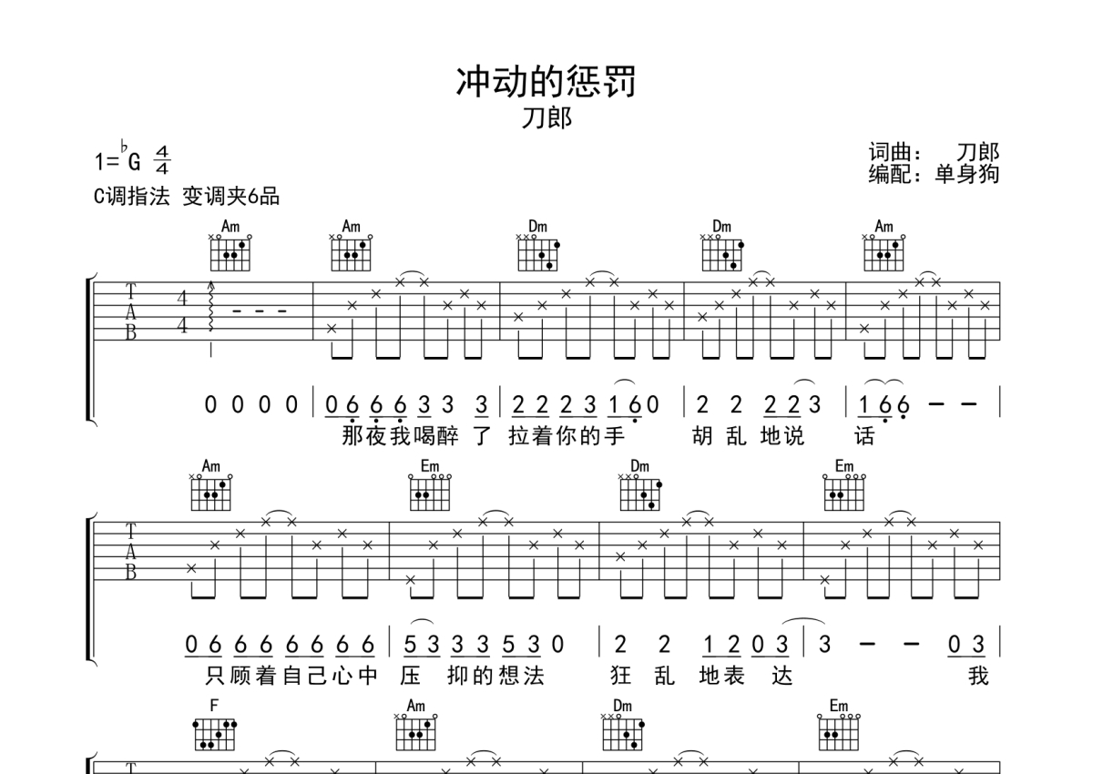 曲谱介绍: 刀郎《冲动的惩罚》吉他弹唱谱,采用C调指法编配,单身狗编配出品,共有6张高清图谱。