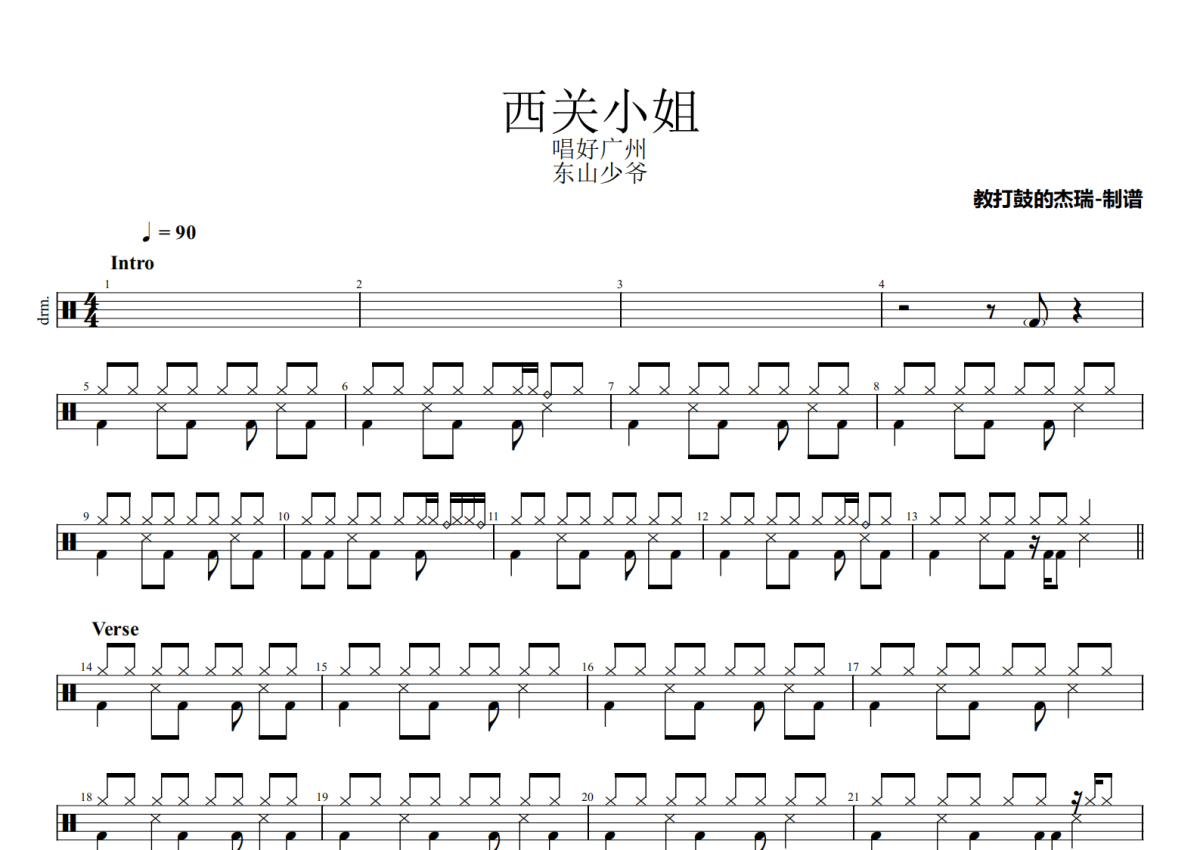 曲谱介绍: 东山少爷《西关小姐》架子鼓谱,Jerry编配出品,共有2张高清图谱,免翻页排版设计。