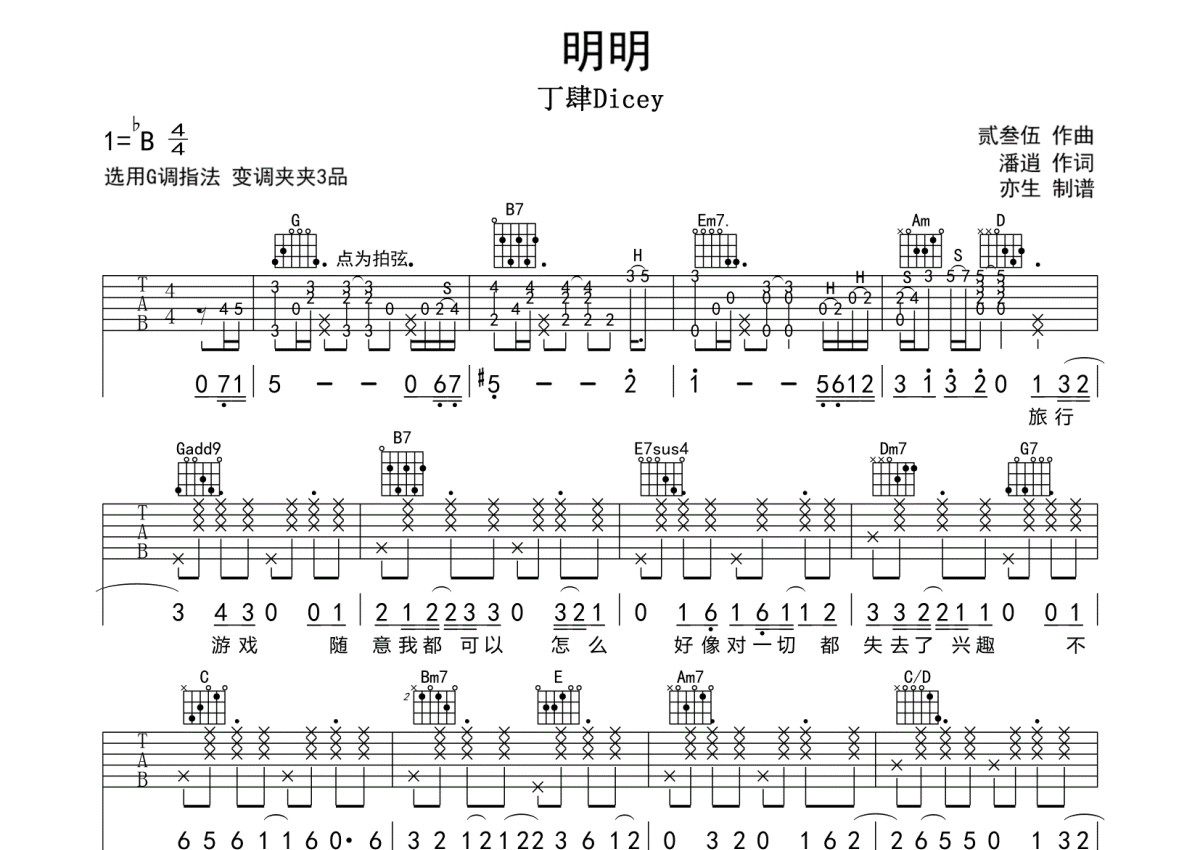 曲谱介绍: 丁肆Dicey《明明》吉他弹唱谱,采用G调指法编配,亦生编配出品,共有2张高清图谱,免翻页排版设计。
