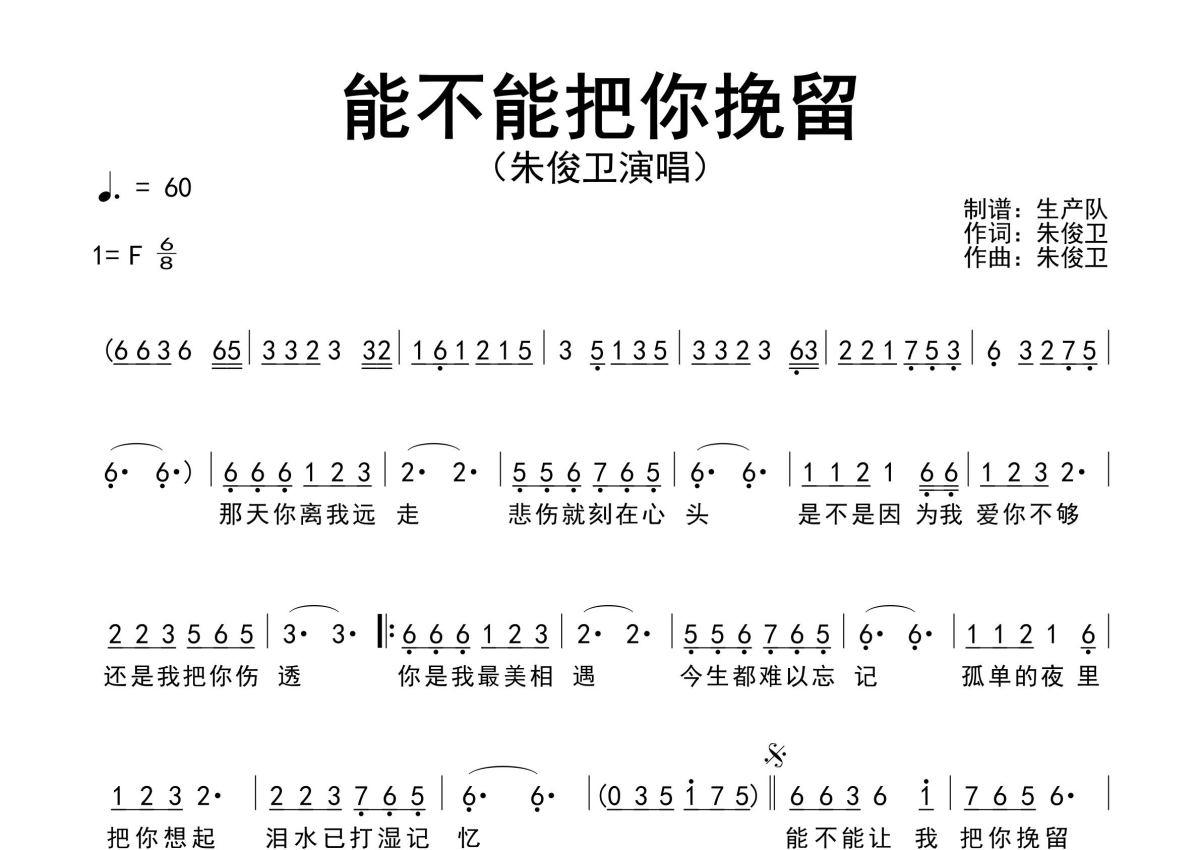 曲谱介绍: 朱俊卫《能不能把你挽留》原版简谱,生产队编配出品,共有1张高清图谱,免翻页排版设计。
