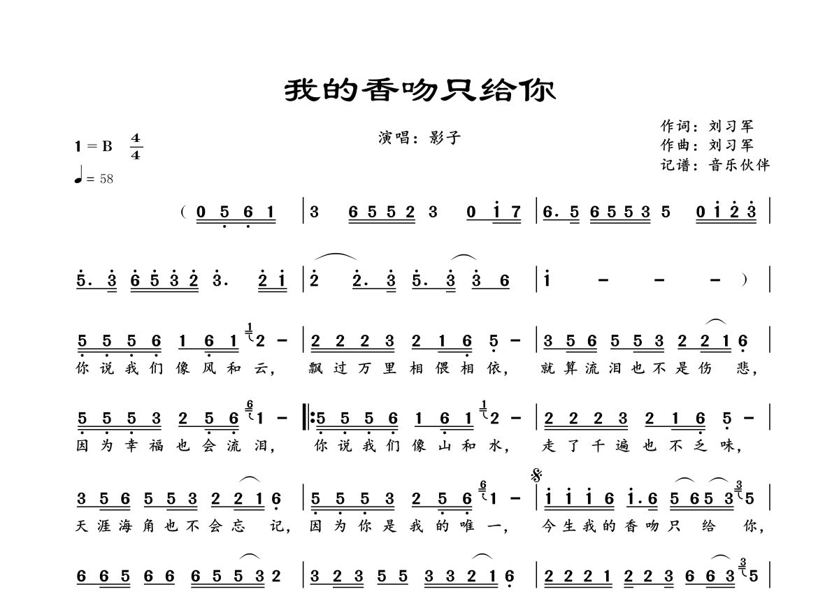 曲谱介绍: 影子《我的香吻只给你》,音乐伙伴编配出品,共有1张高清图谱,免翻页排版设计。