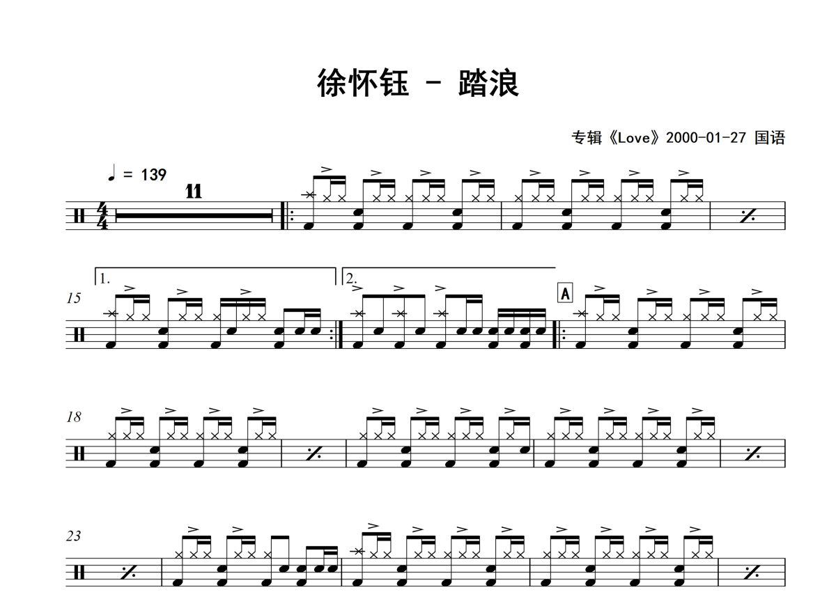 踏浪鼓谱 - 徐怀钰 - 架子鼓谱 - 专辑版