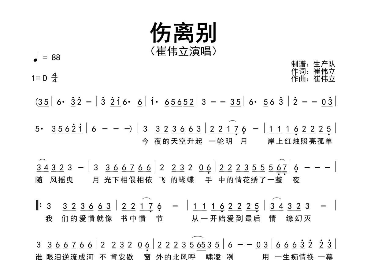 • 伤离别简谱 - 崔伟立 - 原版简谱第1张