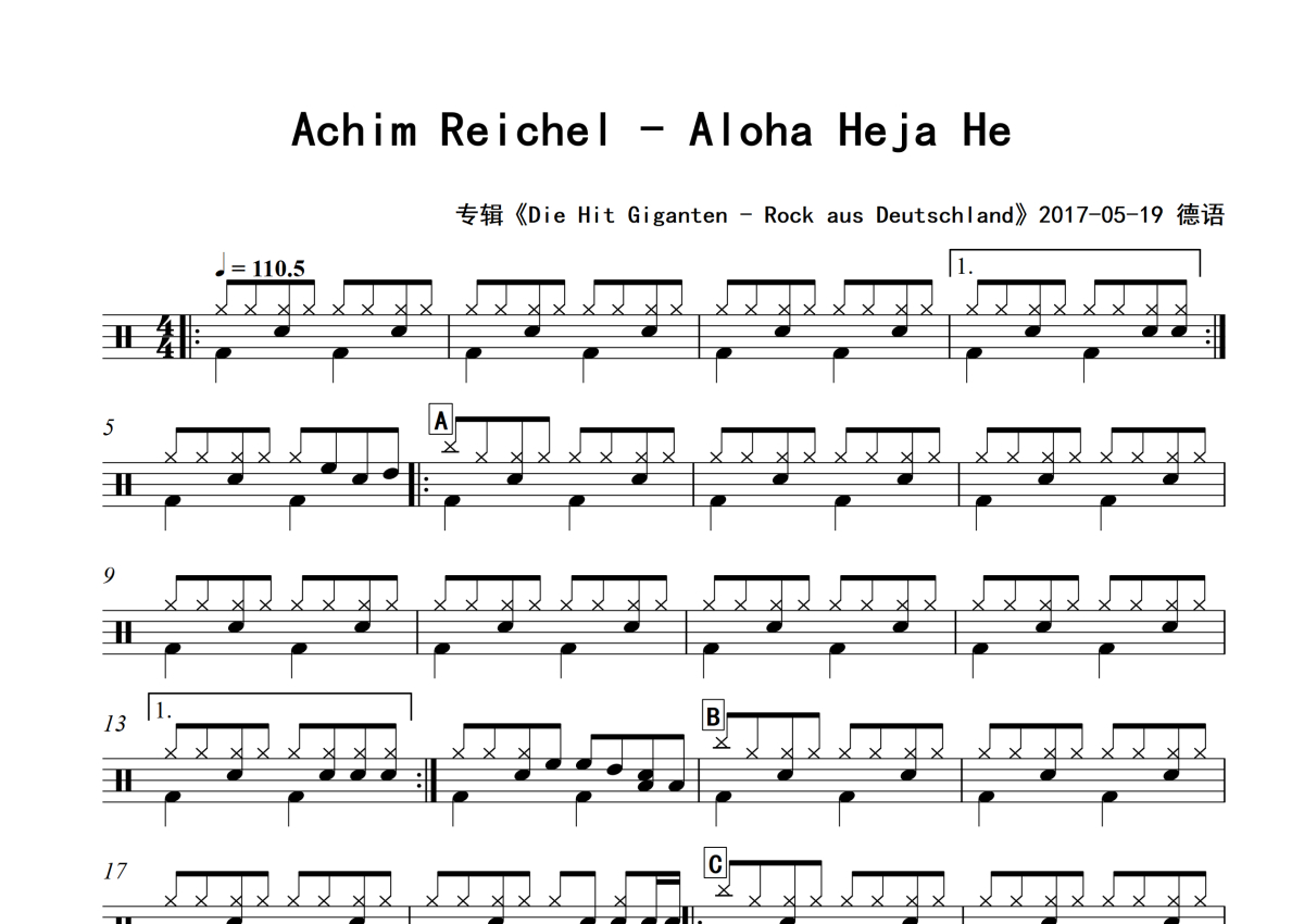 • Aloha Heja He鼓谱 - Achim Reichel - 架子鼓谱 - 专辑版第1张
