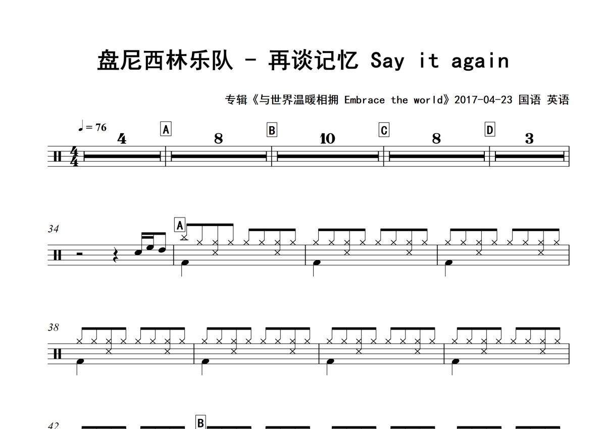 再谈记忆 Say it again鼓谱 - 盘尼西林乐队 - 架子鼓谱 - 专辑版