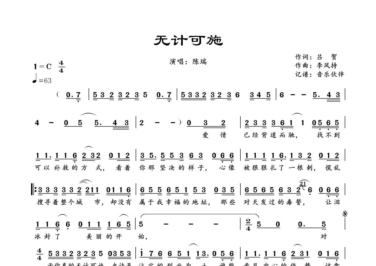 曲谱介绍: 陈瑞《无计可施》,音乐伙伴编配出品,共有1张高清图谱,免翻页排版设计。