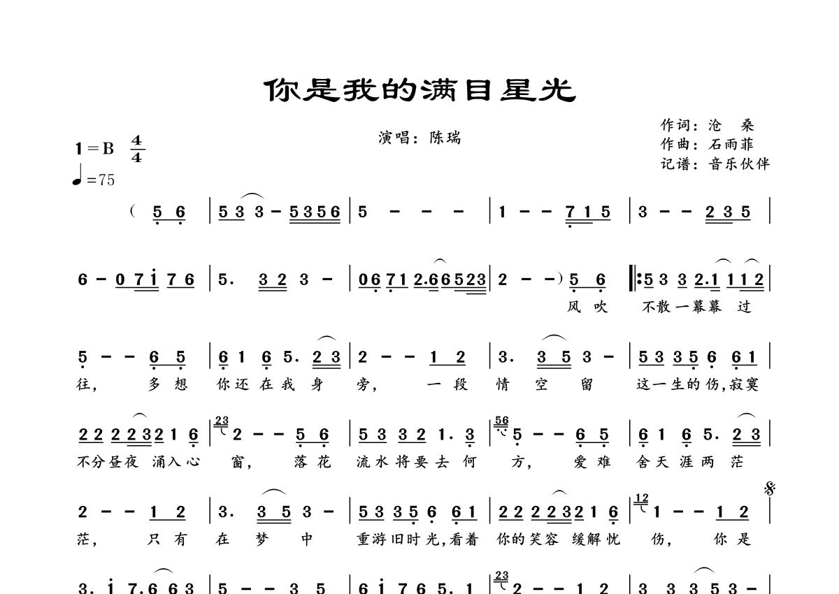 曲谱介绍: 陈瑞《你是我的满目星光》,音乐伙伴编配出品,共有1张高清图谱,免翻页排版设计。