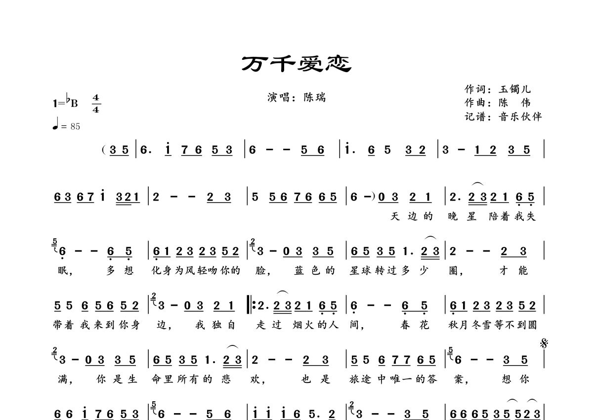 曲谱介绍: 陈瑞《万千爱恋》,音乐伙伴编配出品,共有1张高清图谱,免翻页排版设计。