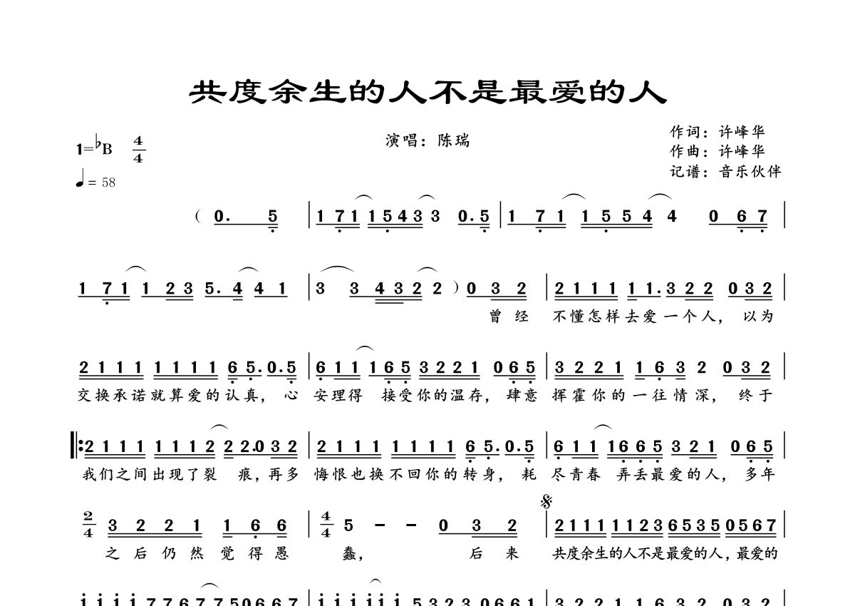 曲谱介绍: 陈瑞《共度余生的人不是最爱的人》,音乐伙伴编配出品,共有1张高清图谱,免翻页排版设计。