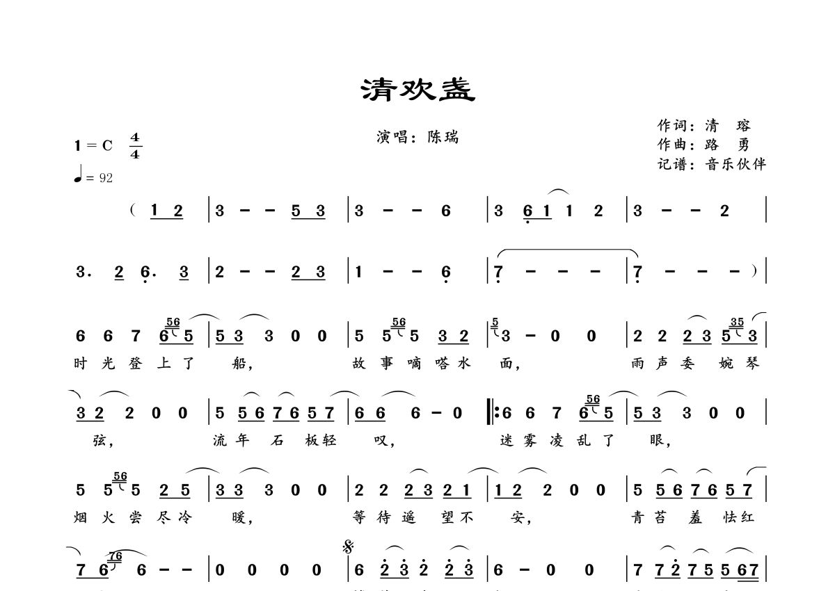 曲谱介绍: 陈瑞《清欢盏》,音乐伙伴编配出品,共有1张高清图谱,免翻页排版设计。