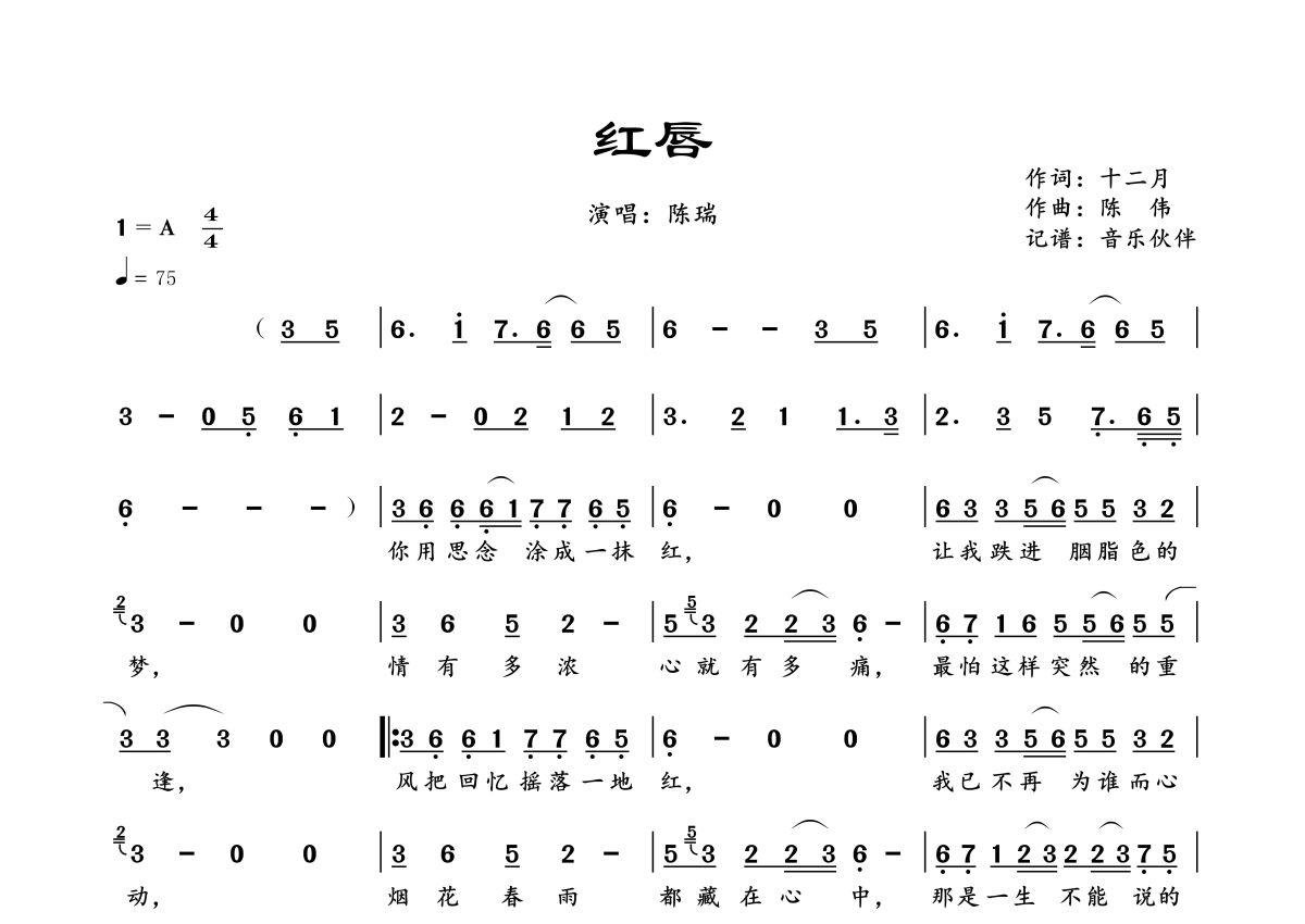 曲谱介绍: 陈瑞《红唇》,音乐伙伴编配出品,共有1张高清图谱,免翻页排版设计。