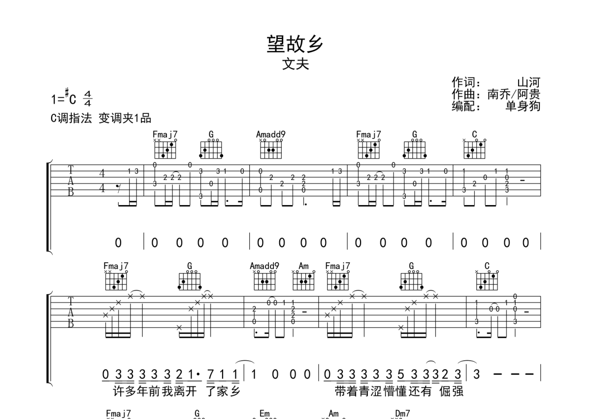 曲谱介绍: 文夫《望故乡》吉他弹唱谱,采用C调指法编配,单身狗编配出品,共有3张高清图谱。