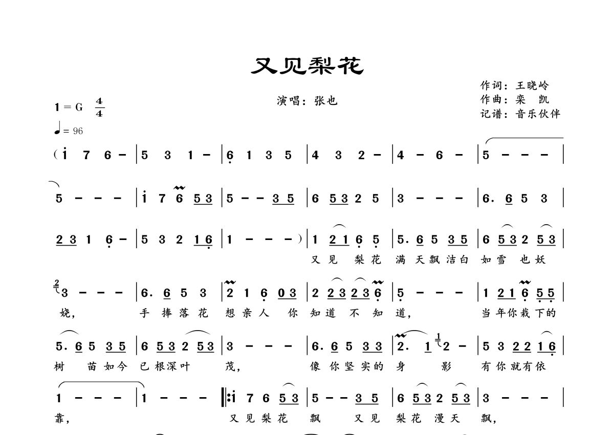 曲谱介绍: 张也《又见梨花》,音乐伙伴编配出品,共有1张高清图谱,免翻页排版设计。