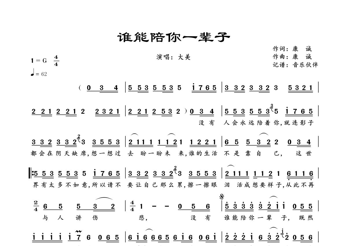 曲谱介绍: 大美《谁能陪你一辈子》,音乐伙伴编配出品,共有1张高清图谱,免翻页排版设计。