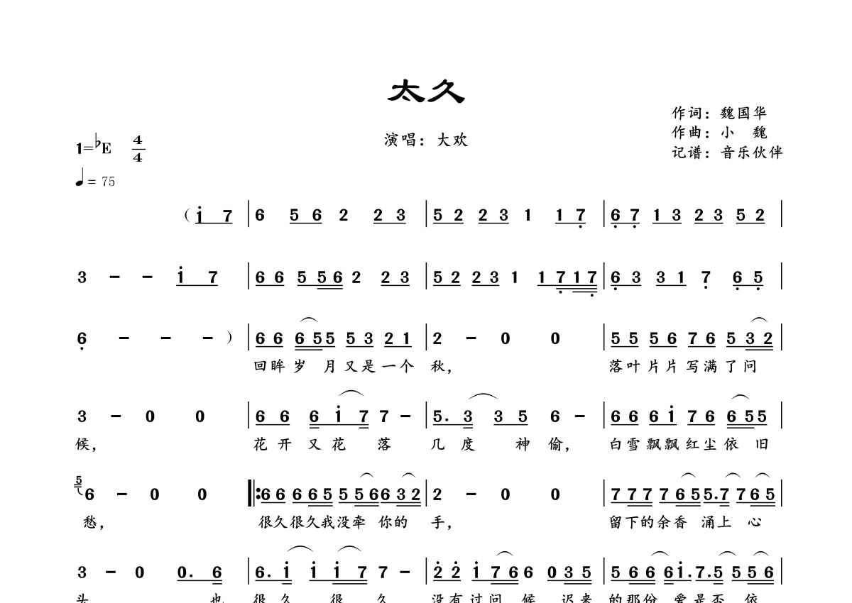 曲谱介绍: 大欢《太久》,音乐伙伴编配出品,共有1张高清图谱,免翻页排版设计。