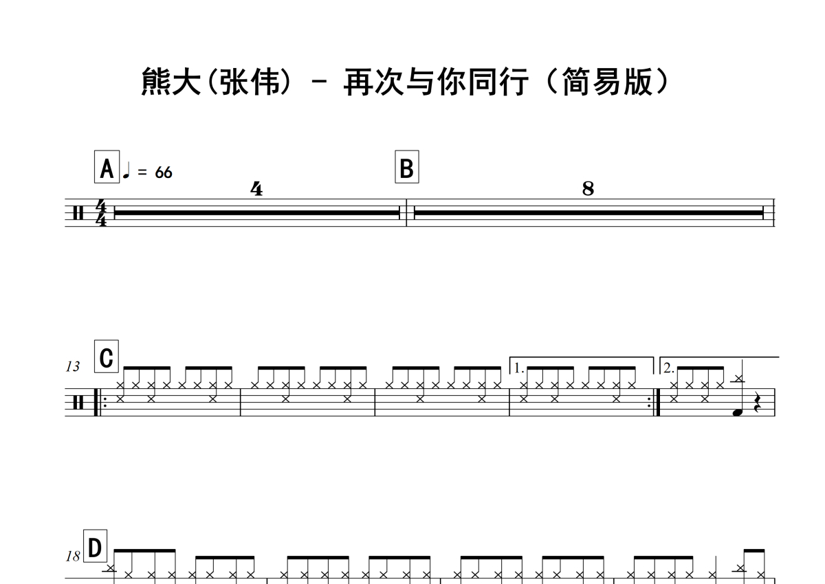 • 再次与你同行鼓谱 - 熊大(张伟) - 架子鼓谱 - 简易版第1张