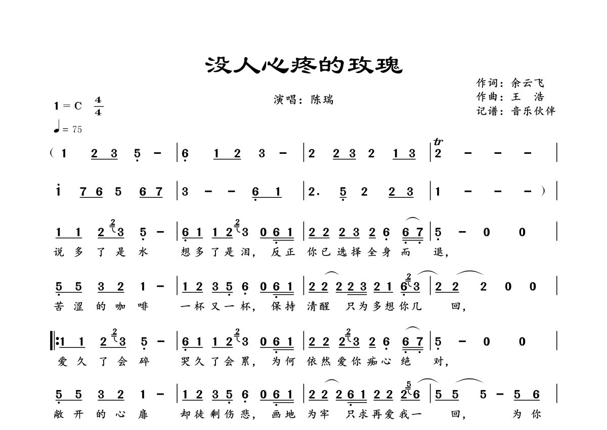 曲谱介绍: 陈瑞《没人心疼的玫瑰》,音乐伙伴编配出品,共有1张高清图谱,免翻页排版设计。
