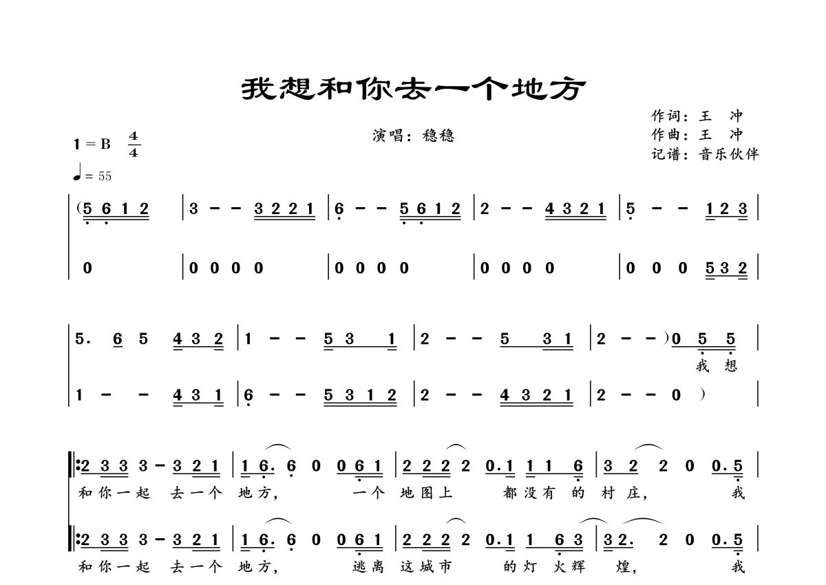 曲谱介绍: 稳稳《我想和你去一个地方》,音乐伙伴编配出品,共有2张高清图谱,免翻页排版设计。