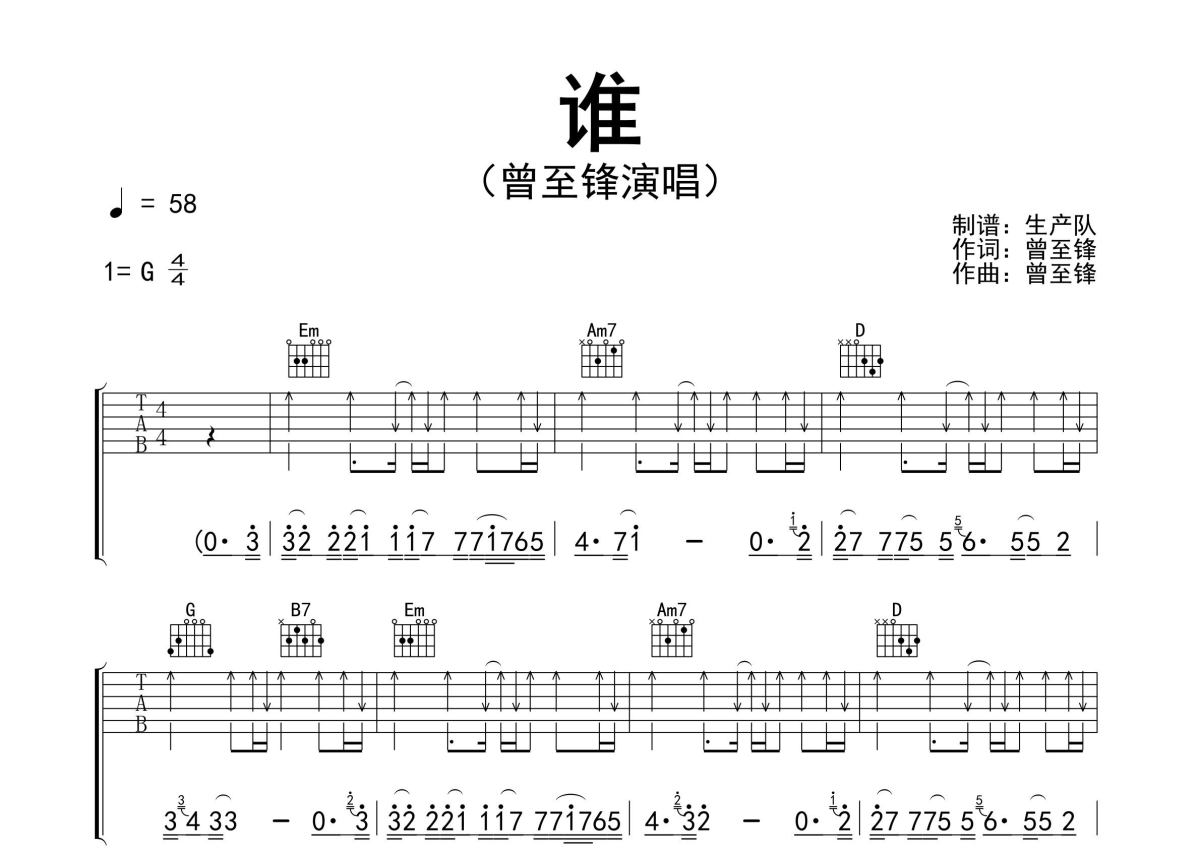 • 谁吉他谱 - 曾至锋 - G调吉他弹唱谱 - 精编民谣版第1张