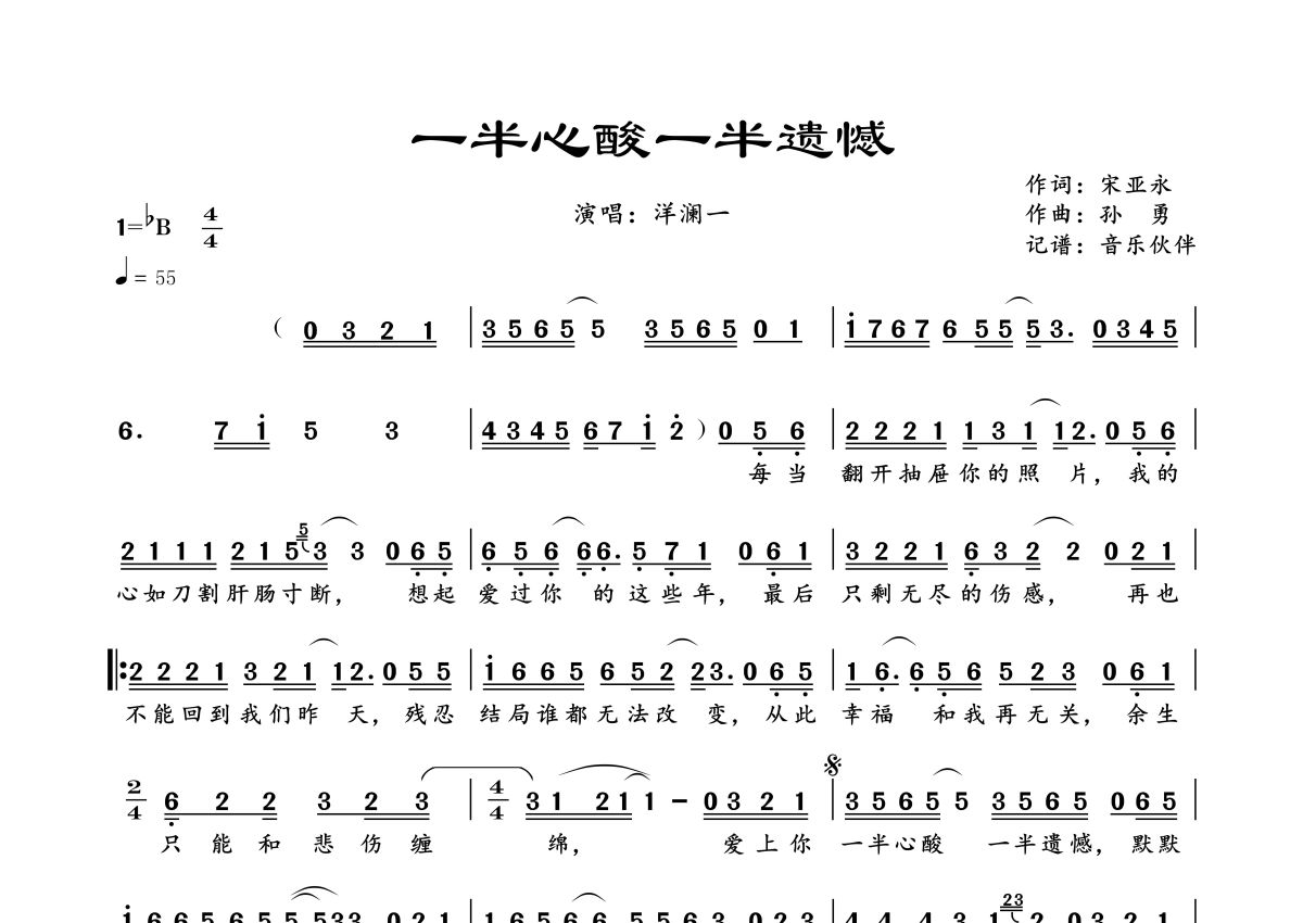 曲谱介绍: 洋澜一《一半心酸一半遗憾》,音乐伙伴编配出品,共有1张高清图谱,免翻页排版设计。