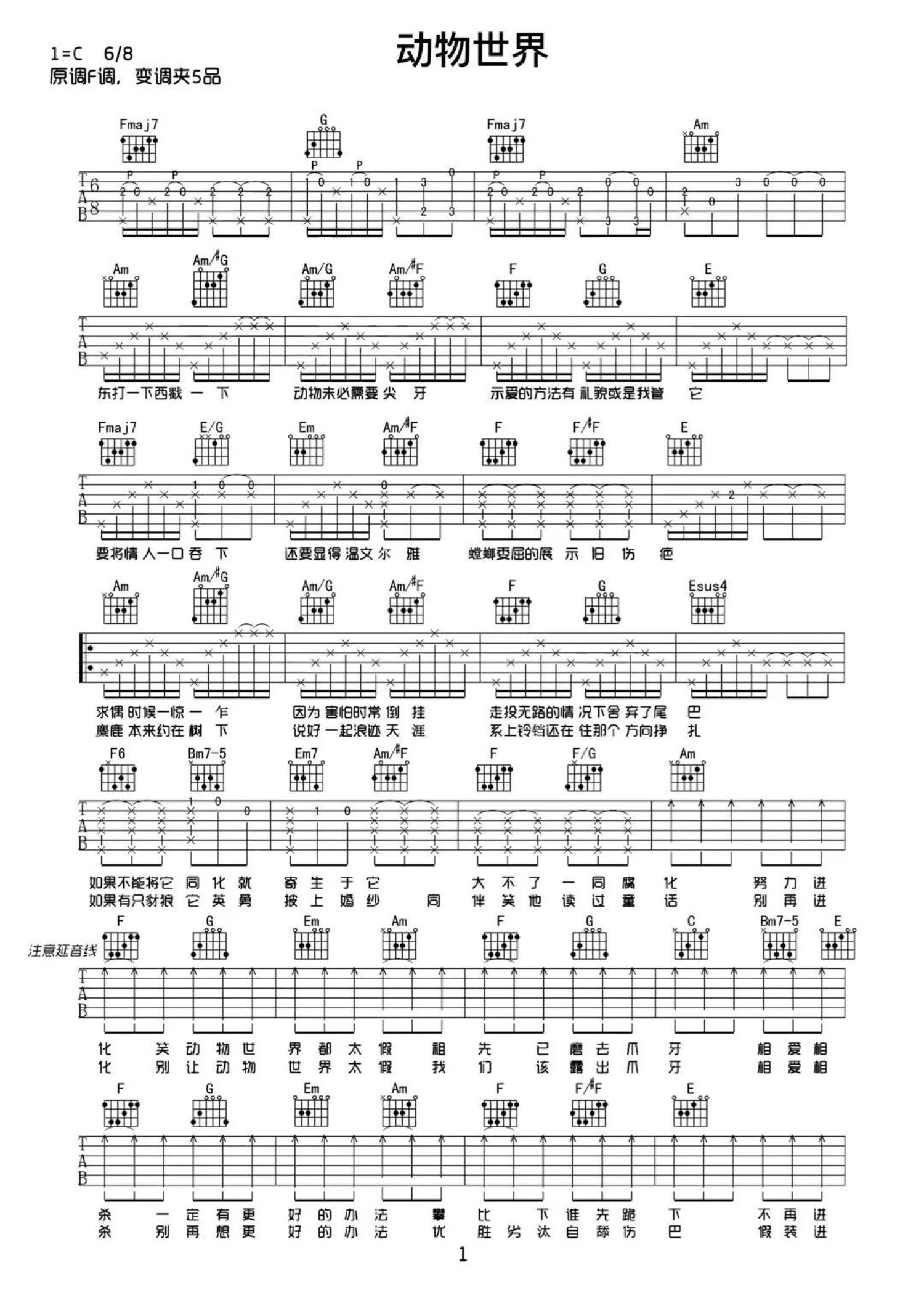 曲谱介绍: 《动物世界》是由郭顶作曲,薛之谦作词并演唱的歌曲,收录于薛之谦2017年11月28日发行的专辑《渡 The Crossing》中。 2017年6月21日,该曲获得全球流行音乐金榜上半年二十大金曲奖。