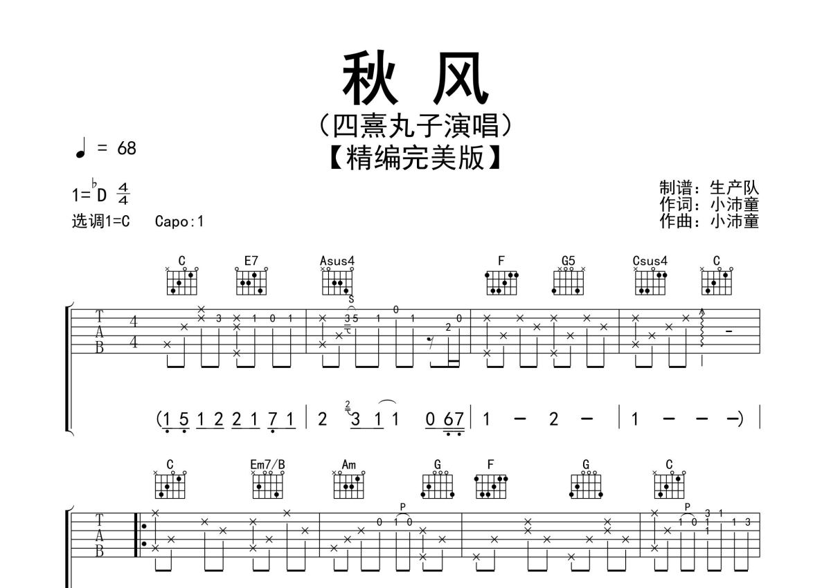 曲谱介绍: 四熹丸子《秋风》吉他弹唱谱,采用C调指法编配精编完美版,生产队编配出品,共有3张高清图谱。