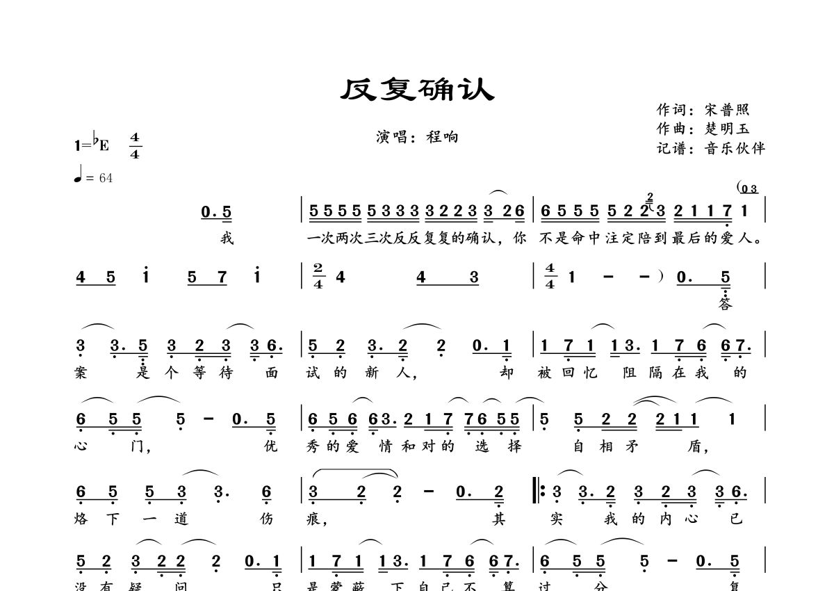 曲谱介绍: 程响《反复确认》,音乐伙伴编配出品,共有1张高清图谱,免翻页排版设计。