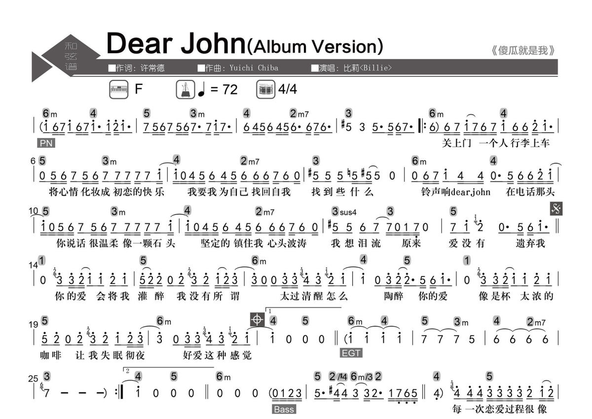 • Dear John简谱 - 比莉 - 数字级数和弦谱第1张