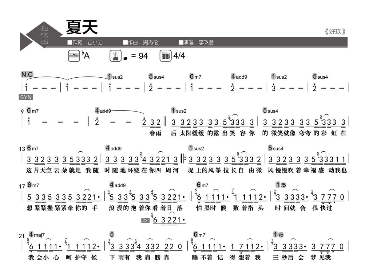 夏天简谱 - 李玖哲 - 数字级数和弦谱