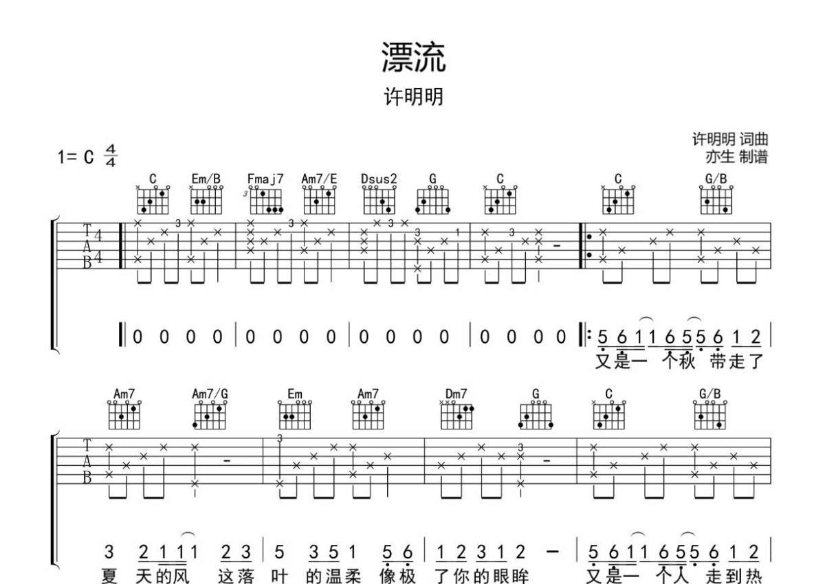 • 漂流吉他谱 - 许明明 - C调吉他弹唱谱第1张