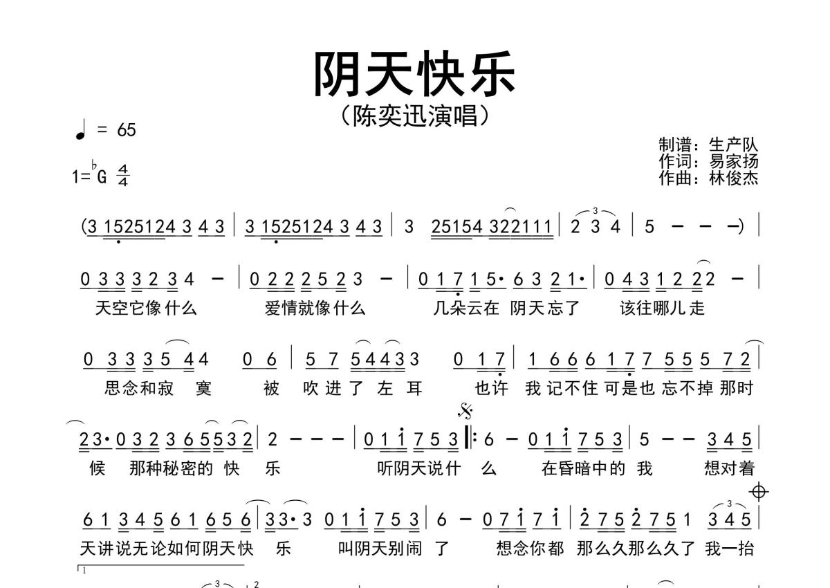 曲谱介绍: 陈奕迅《阴天快乐》原版简谱,生产队编配出品,共有1张高清图谱,免翻页排版设计。