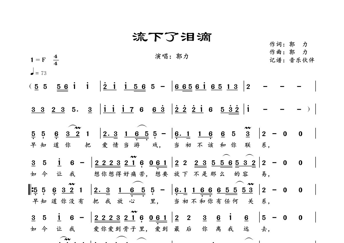 曲谱介绍: 郭力《流下了泪滴》,音乐伙伴编配出品,共有1张高清图谱,免翻页排版设计。