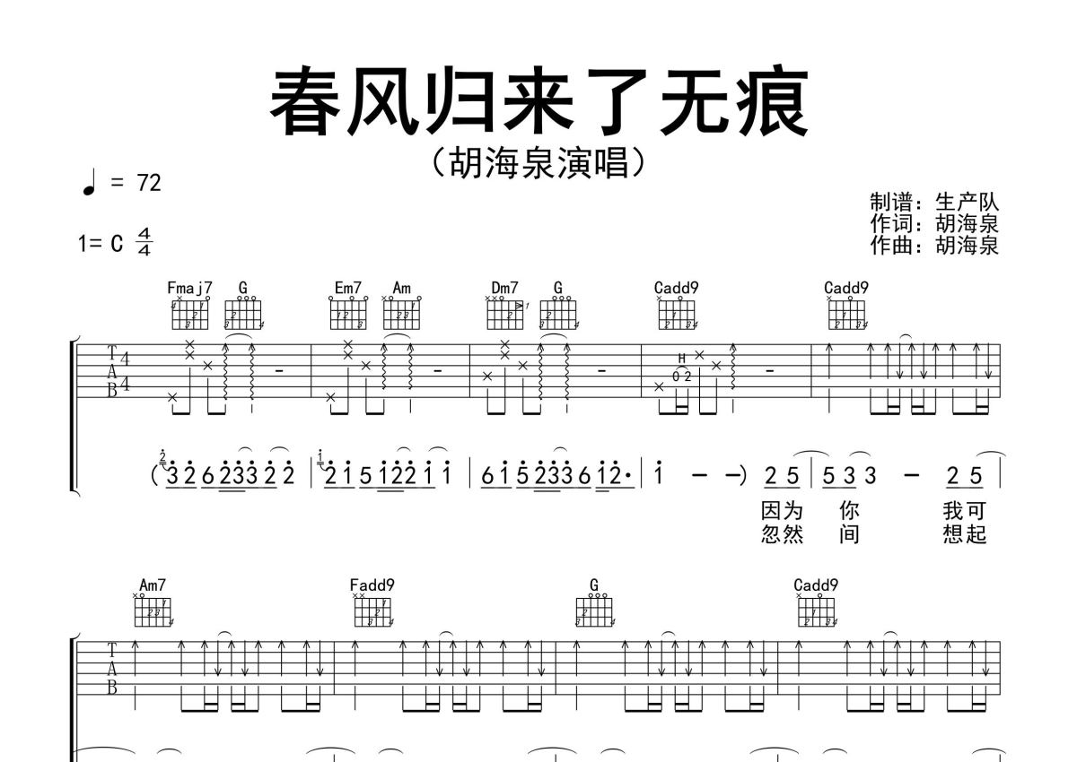 曲谱介绍: 胡海泉《春风归来了无痕》吉他弹唱谱,采用C调指法编配精编完美版,生产队编配出品,共有2张高清图谱,免翻页排版设计。