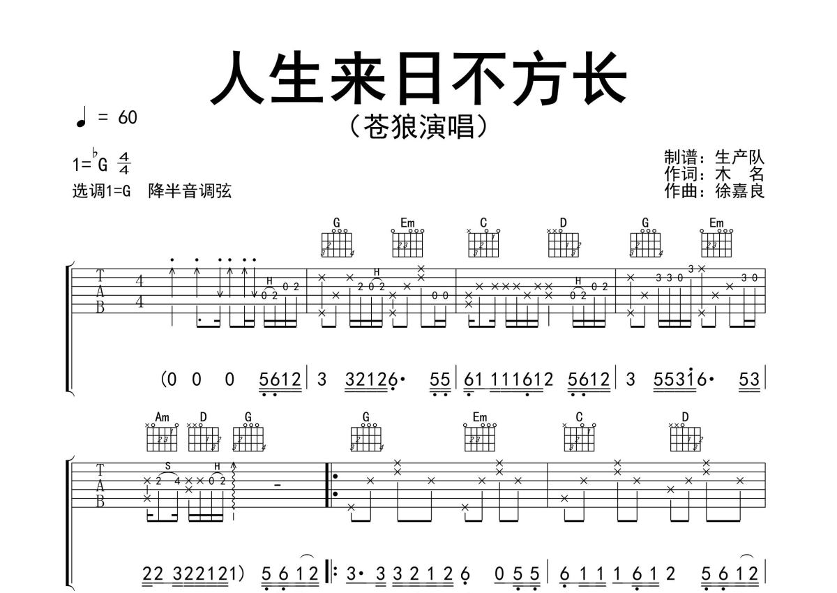 曲谱介绍: 苍狼《人生来日不方长》吉他弹唱谱,采用G调指法编配精编完美版,生产队编配出品,共有3张高清图谱。