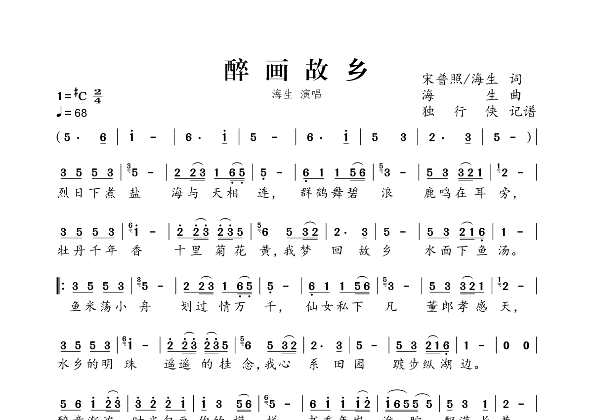 曲谱介绍: 海生《醉画故乡》,独行侠编配出品,共有1张高清图谱,免翻页排版设计。