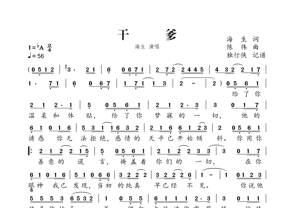 曲谱介绍: 海生《干爹》,独行侠编配出品,共有1张高清图谱,免翻页排版设计。