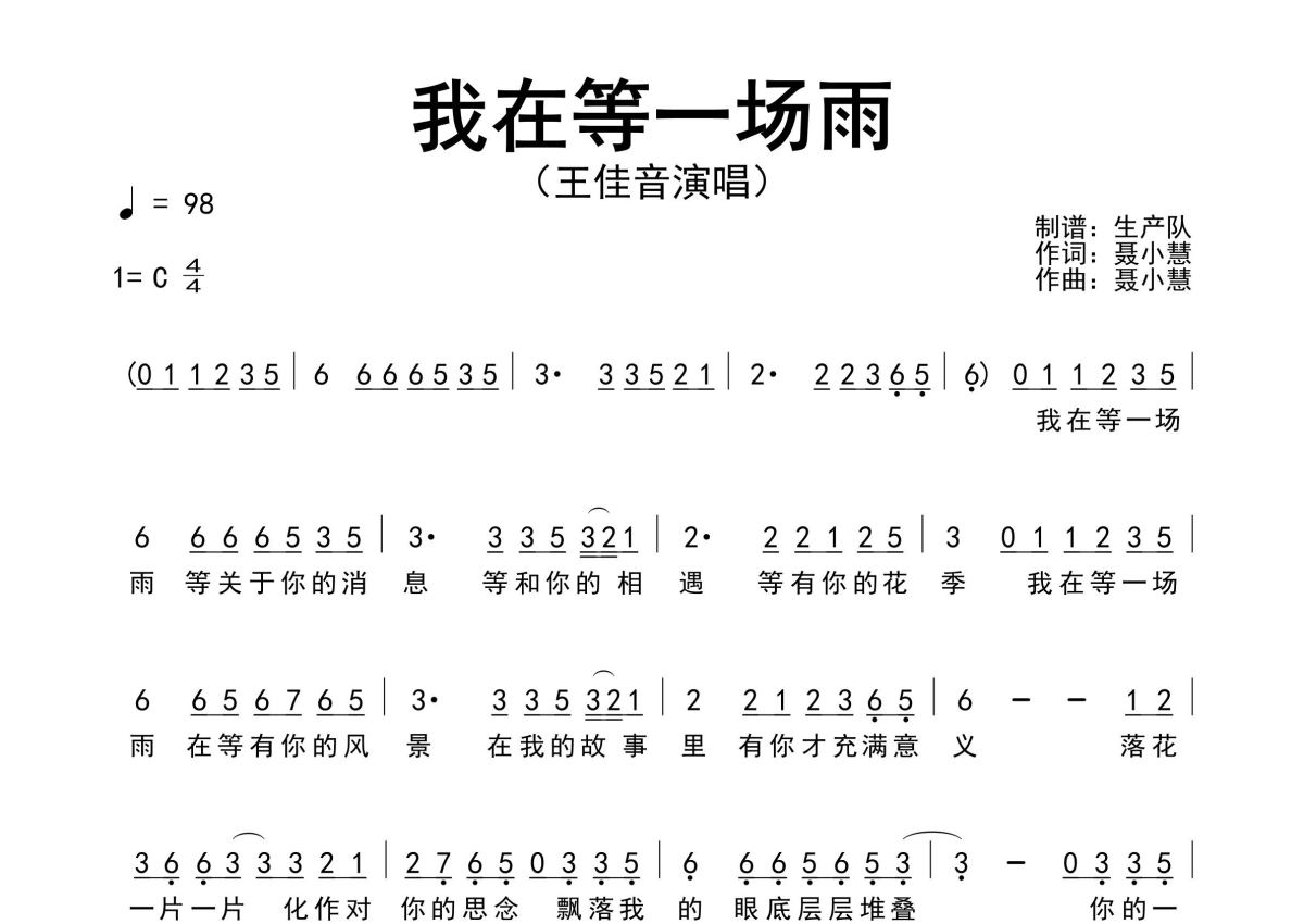 曲谱介绍: 王佳音《我在等一场雨》原版简谱,生产队编配出品,共有2张高清图谱,免翻页排版设计。