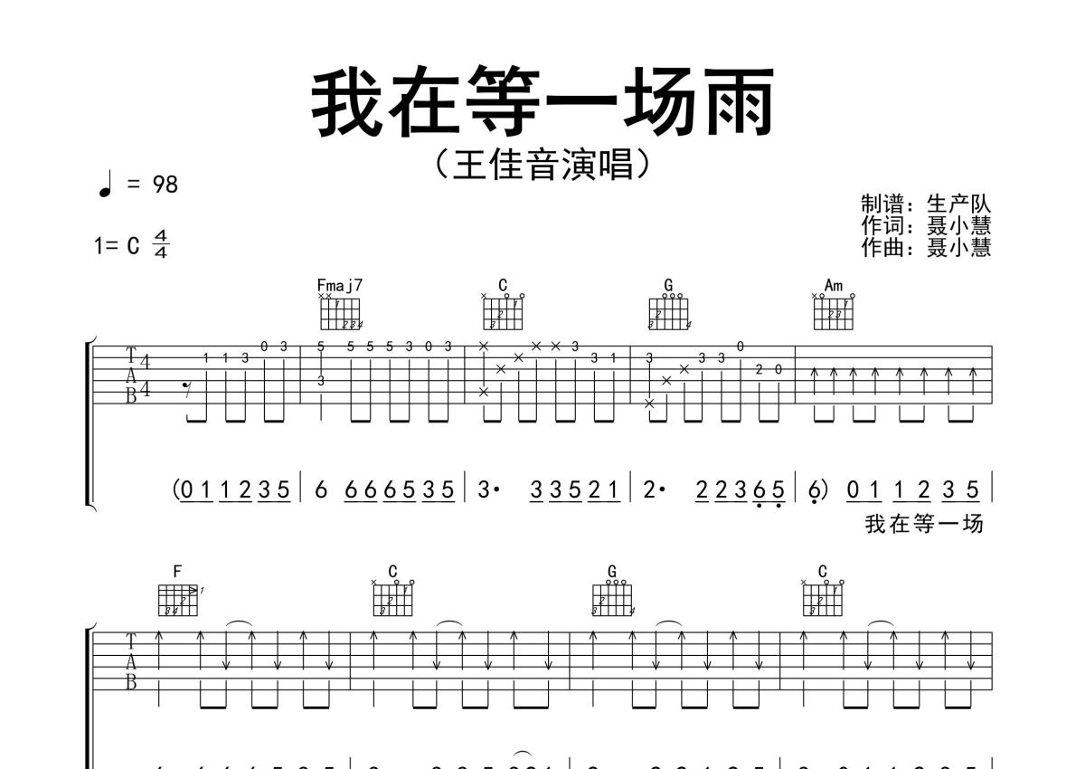 曲谱介绍: 王佳音《我在等一场雨》吉他弹唱谱,采用C调指法编配精编完美版,生产队编配出品,共有3张高清图谱。