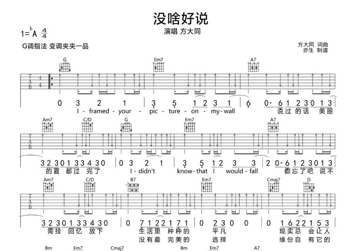 曲谱介绍: 方大同《没啥好说》吉他弹唱谱,采用G调指法编配,亦生编配出品,共有2张高清图谱,免翻页排版设计。